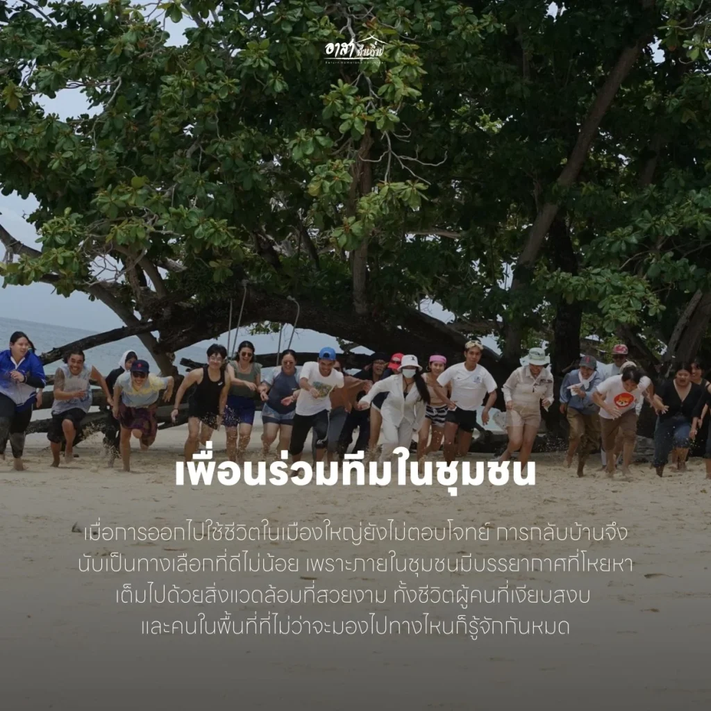 แต่เมื่อการออกไปใช้ชีวิตในเมืองใหญ่ยังไม่ตอบโจทย์ การกลับบ้านจึงนับเป็นทางเลือกที่ดีไม่น้อย เพราะภายในชุมชนมีบรรยากาศที่โหยหา เต็มไปด้วยสิ่งแวดล้อมที่สวยงาม ทั้งชีวิตผู้คนที่เงียบสงบ และคนในพื้นที่ที่ไม่ว่าจะมองไปทางไหนก็รู้จักกันหมด